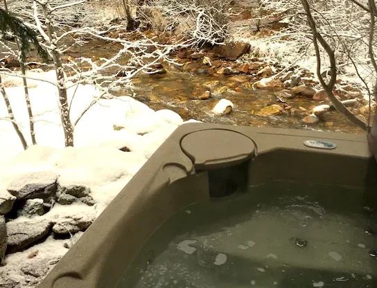 This 3-bedroom home-away-from-home features two full baths and a fully equipped kitchen. A 6-person hot tub and an infrared sauna are the real highlights, and as a bonus, they are located right next to a stream.